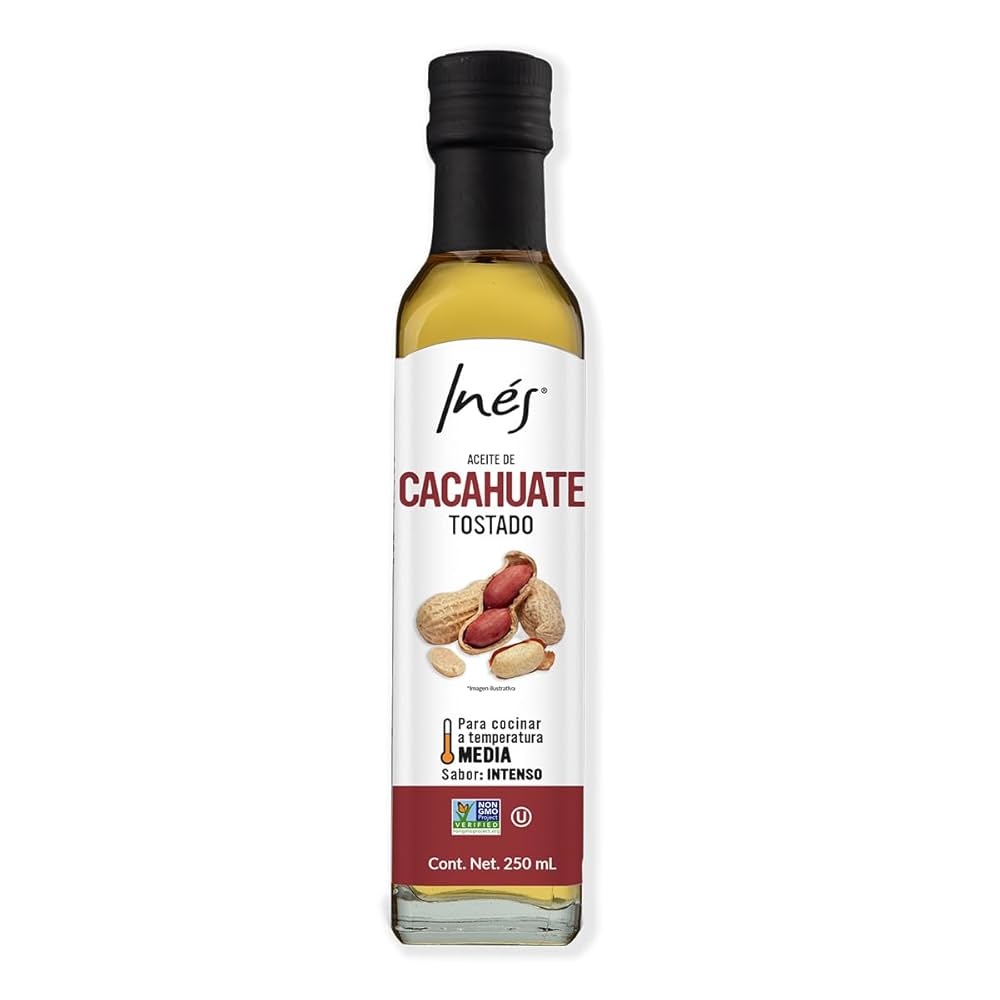 El aceite de cacahuate Inés es un condimento gourmet elaborado a partir de cacahuates tostados seleccionados, lo que le confiere un sabor profundo, ligeramente dulce y tostado, ideal para realzar platillos con un toque asiático o creativo