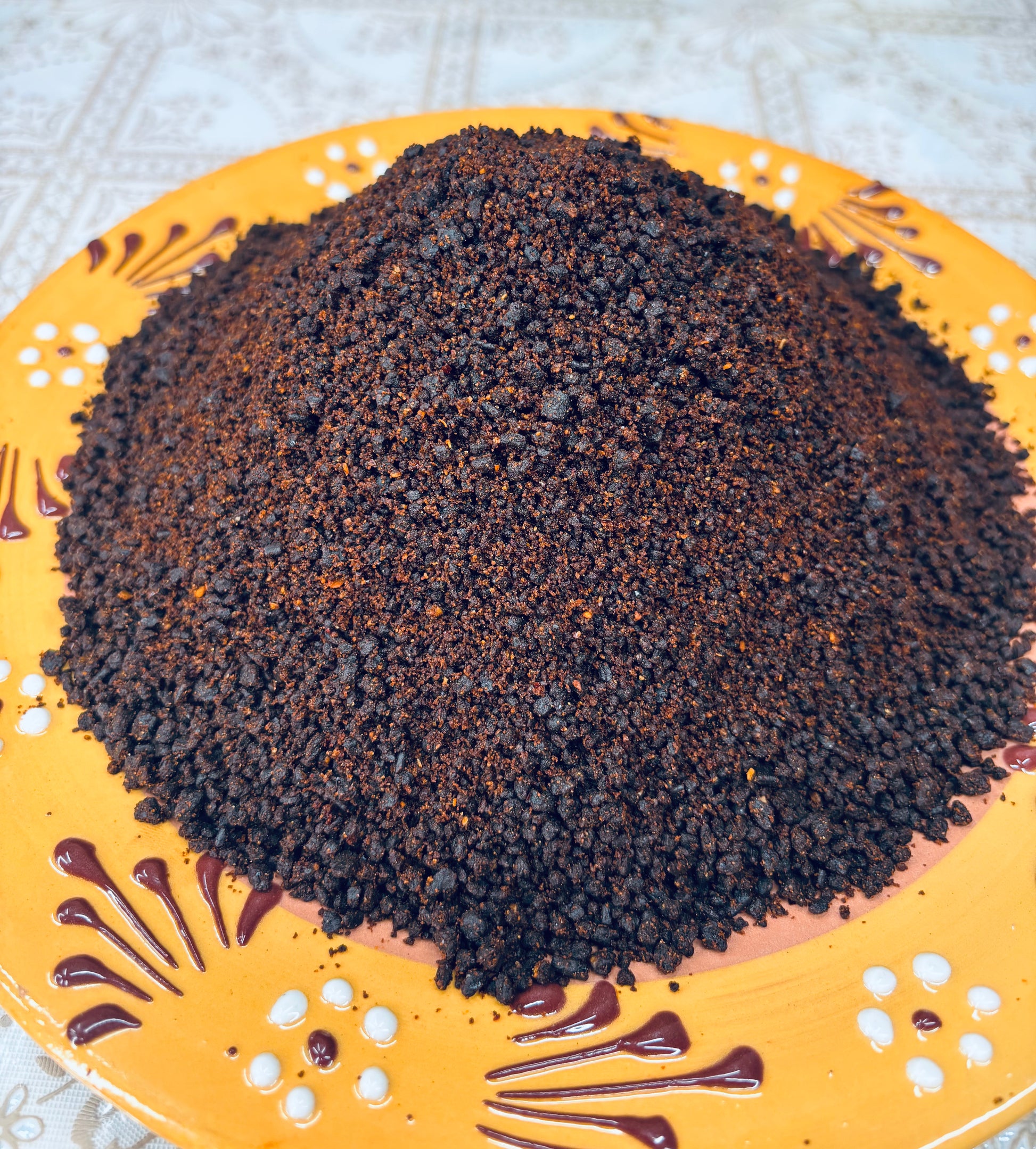 Este mole se presenta como una mezcla seca y aromática de chiles secos (ancho, pasilla, mulato), semillas (ajonjolí, cacahuate), especias (canela, clavo, comino), y un toque de chocolate amargo. Al rehidratarse con caldo caliente, se transforma en una salsa espesa, rica y reconfortante, perfecta para acompañar carnes, arroz o tamales.