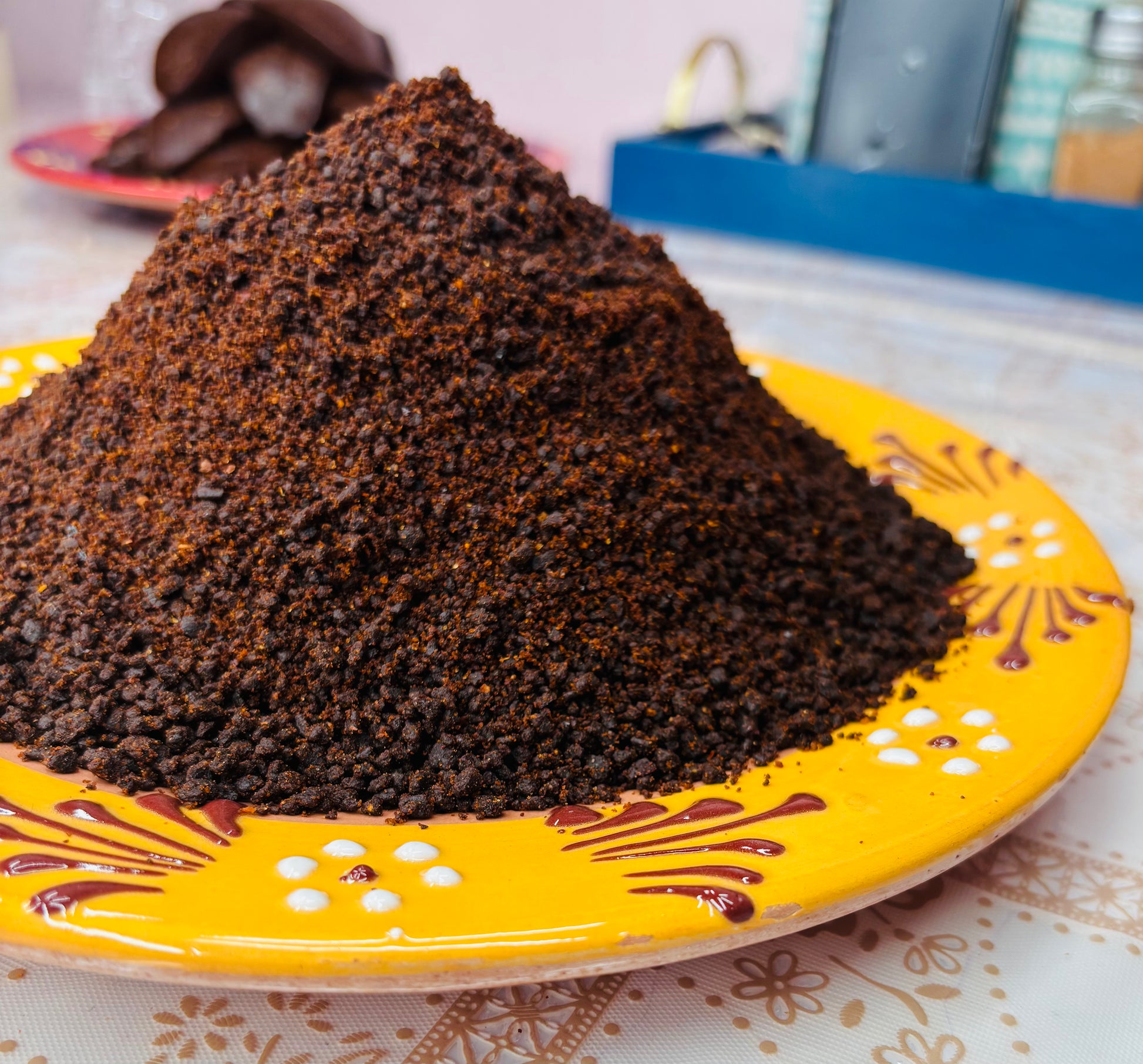 Mezcla de chiles secos como chile de árbol, guajillo, pasilla y chipotle, junto con especias aromáticas , semillas.