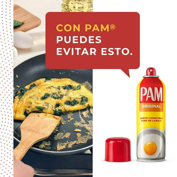 El Aceite Pam Original es un aceite comestible puro de canola en presentación en aerosol, ideal para cocinar de forma práctica y saludable. Gracias a su sistema de aplicación, permite cubrir uniformemente sartenes y moldes con una mínima cantidad de grasa, ayudando a reducir hasta tres veces el uso de aceite comparado con las versiones líquidas