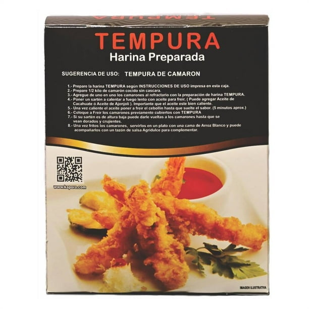 La harina de tempura Kaporo® es una mezcla especial de harinas de trigo enriquecidas, condimentos y sal, inspirada en una técnica japonesa con siglos de tradición. Solo necesitas agregar agua fría poco a poco hasta formar una pasta líquida, y está lista para usarse.